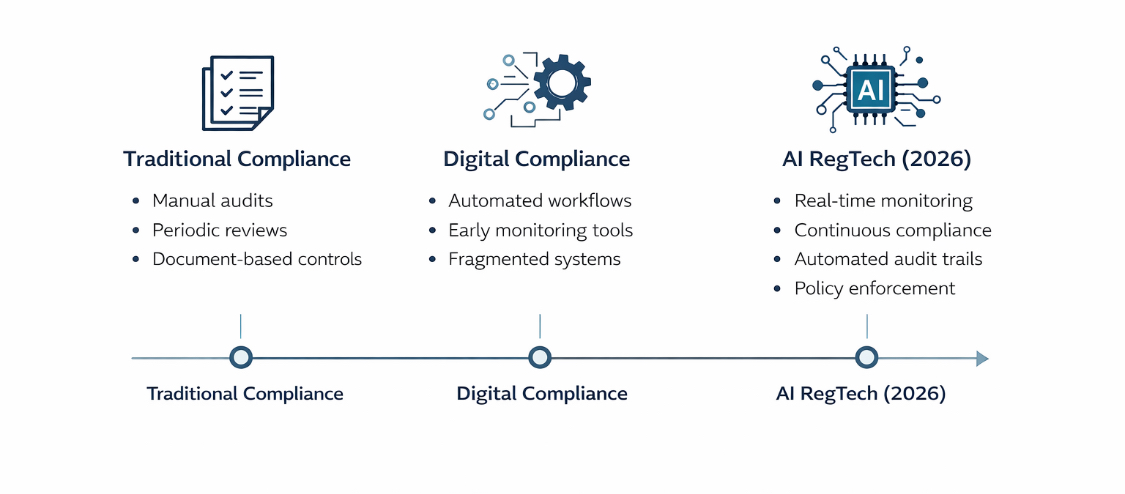 Regulatory expectations have moved from policy-level alignment to operational proof. Organizations are now required to demonstrate how AI systems are monitored, controlled, and documented in real time. RegTech provides the infrastructure to automate these processes, making continuous compliance possible rather than relying on periodic reviews.