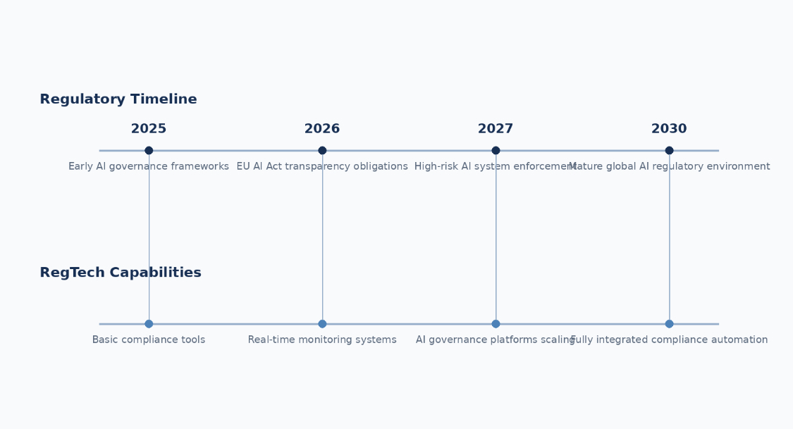 RegTech capabilities align closely with these milestones. Real-time monitoring supports ongoing compliance once systems are deployed. Policy mapping tools help organizations interpret new obligations as they emerge. Governance platforms provide the structure needed to document and demonstrate compliance. Cloud-native systems extend that structure across distributed environments.