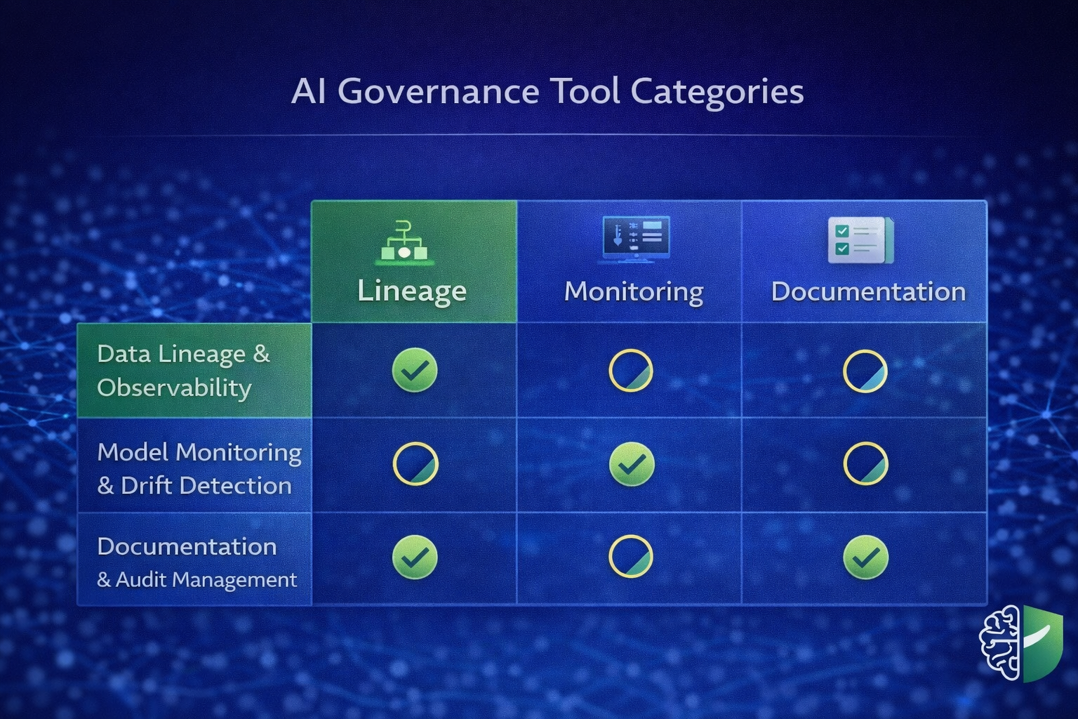 method for assessing governance platforms across data lineage, model monitoring, and audit readiness.