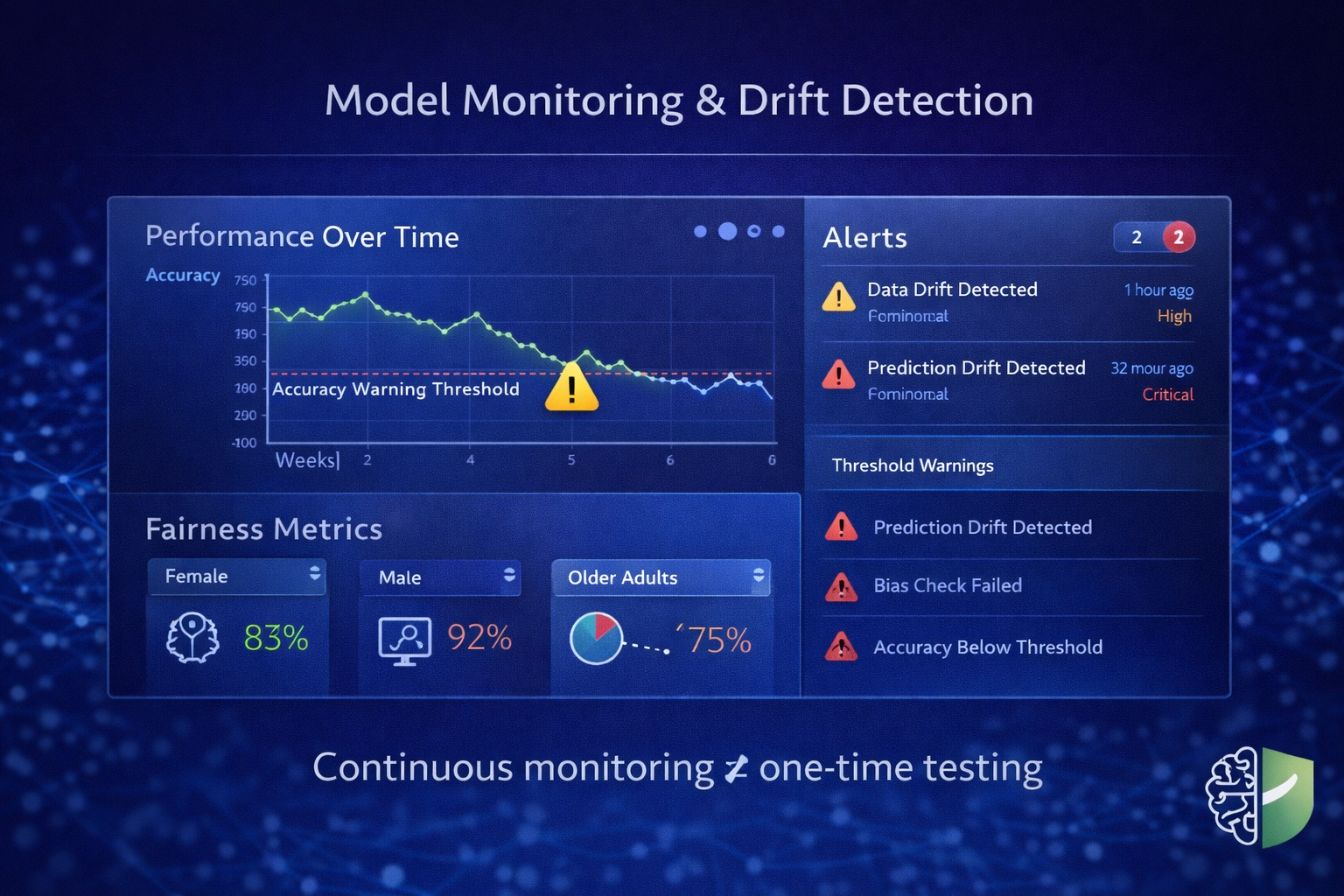 - Data drift and concept drift detection tied to deployment context